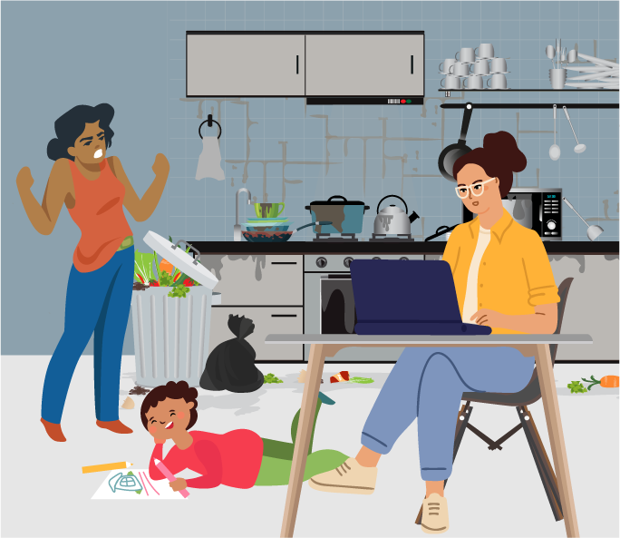 Stonewalling is the ‘silent treatment’, walking away, avoiding eye contact, becoming ‘busy’ with something else [returning to the same graphic, instead of being defensive, the mum at the laptop completely ignores the mum returning home and turns on the radio and begins singing with the toddler].