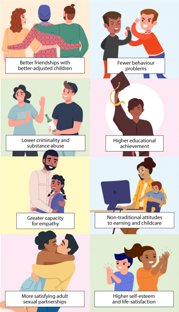 In the UK, when a father works flexibly and shares childcare, the child’s mother is almost twice as likely to progress in her career as when he works inflexibly and does little childcare (Frith, 2016)